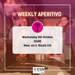 Hello beautiful people! We're happy to invite you to our Weekly Aperitivo, where you can practice your language skills, meet new people or simply talk to us from ESN Trieste. We can sum it up in one sentence: a night among friends!